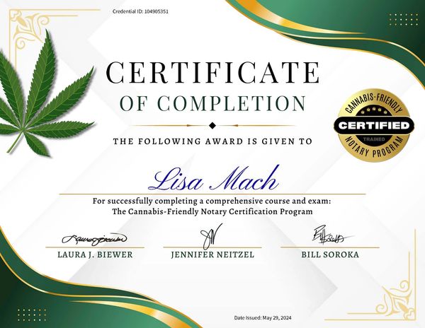 A Cannabis Friendly Notary Public is educated in the legalities surrounding the industry. A CF Notary Public is willing to provide notarial services to those involved in it because they understand the specific needs and regulatory challenges faced by cannabis businesses, including dispensaries, growers and users.